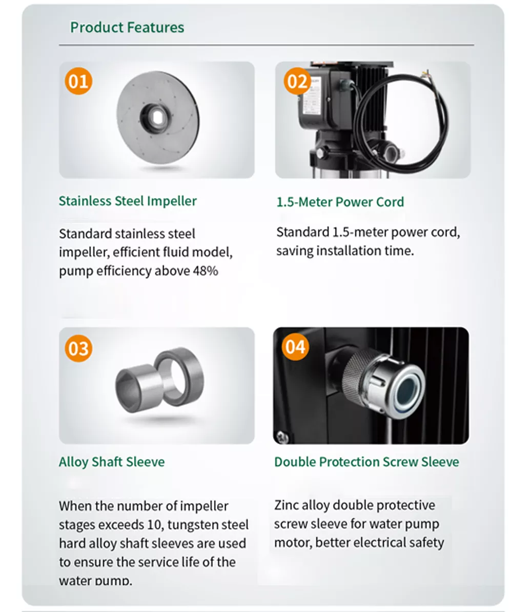 विभिन्न आवश्यकताओं को पूरा करने के लिए इम्पेलर्स की संख्या को बदलकर पंप हेड को समायोजित किया जा सकता है। यह साफ पानी या समान गुणों वाले तरल पदार्थों के लिए उपयुक्त है, जबकि कुछ मॉडलों को संक्षारक मीडिया के लिए अनुकूलित किया जा सकता है।